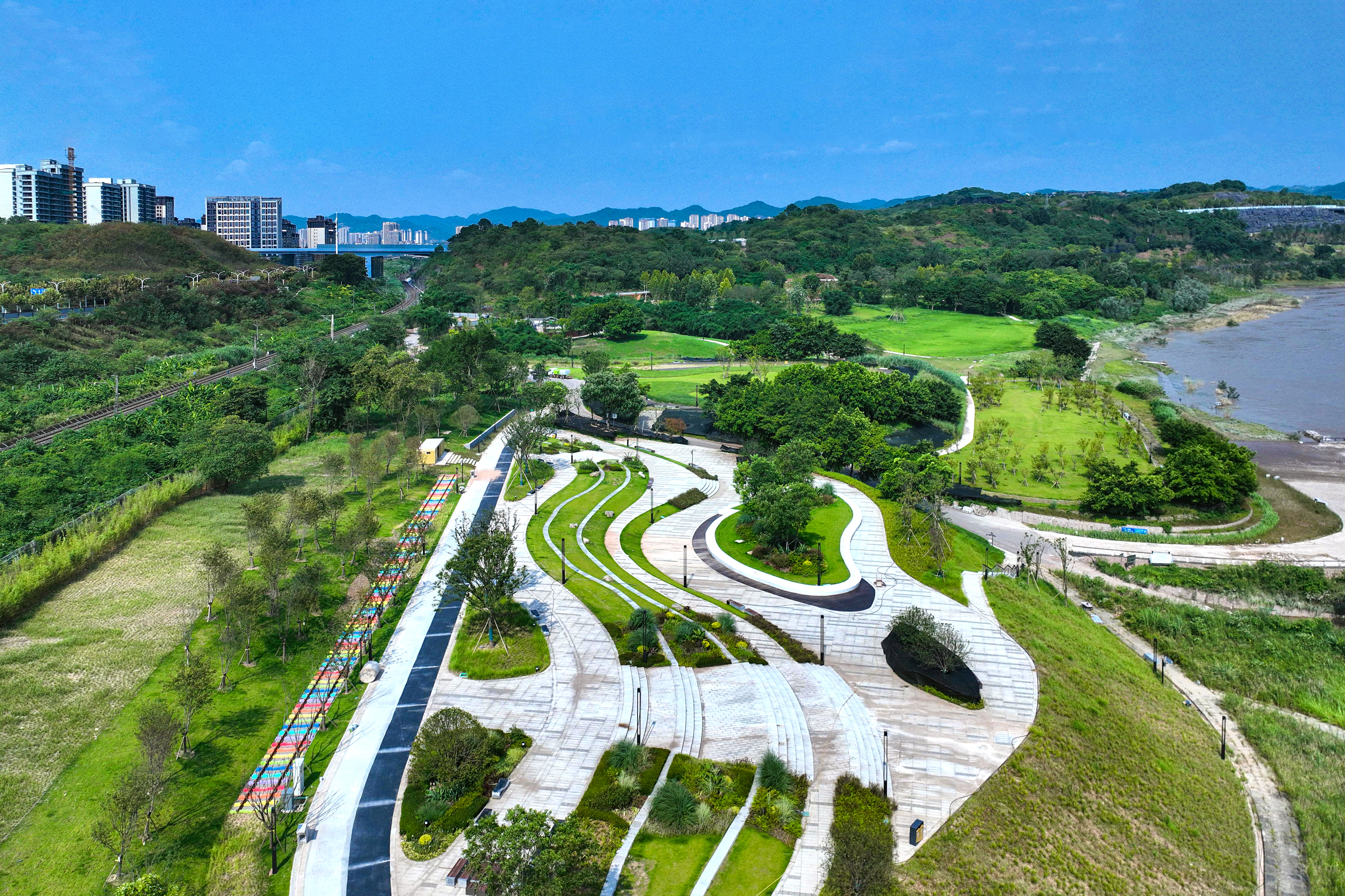 中冶建工承建的重慶“兩江四岸”治理提升長江北岸線延伸工程釣魚嘴濱江段項目,是重慶市重點工程,也是“兩江四岸”治理提升重點項目,全長約4.2公里,通過微改造,巧妙利用現有草海、森林、江灘等資源,彰顯原生態自然景觀,使生態美景連點成線,讓群眾享受更多開窗見景、推門見綠的城市空間,成為全國各地增植補綠、打造生態宜居城市的典范。